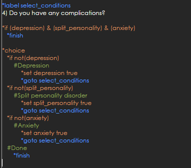In my game at the beginning of the game I am giving the player options on different conditions they start out with. But I want to give the player the option to choose more than one of those conditions. I found a way to loop the choice but if the player selects all but one of the options it has an error. I tried fixing it with an if statement but it’s producing an error. How do I fix it? And is there a better way to do this?