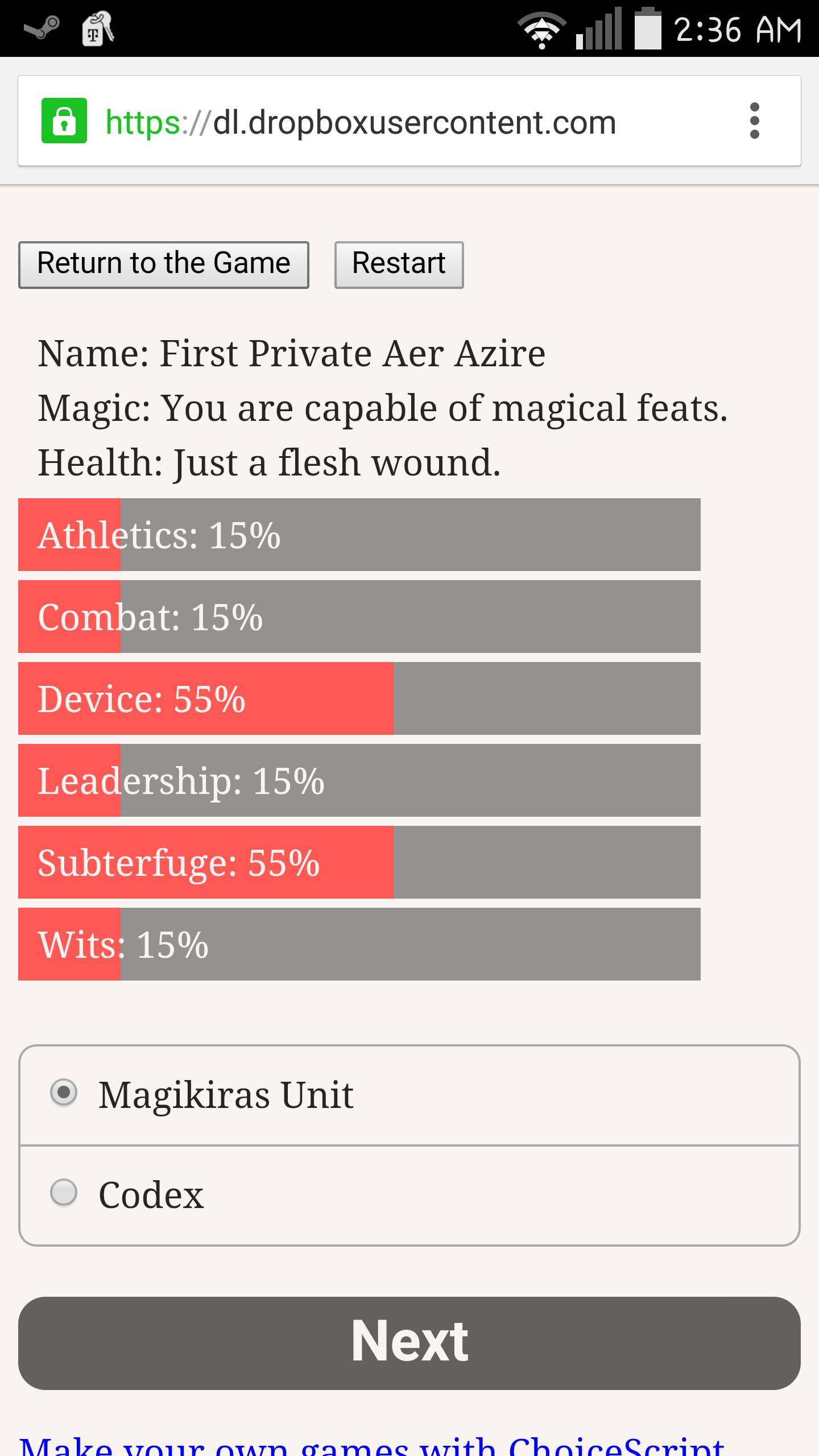 Ah. I found a mistake in the raw magic section. Let off the coding of the variable. Okay, that option is fixed. The other options are won’t work for you because they test the other stats instead of subterfuge and device and because I didn’t fix the Einherjar suit properly, I don’t think the Einherjar suit upgrade was working, which is why it didn’t show the Einherjar’s upgrade.