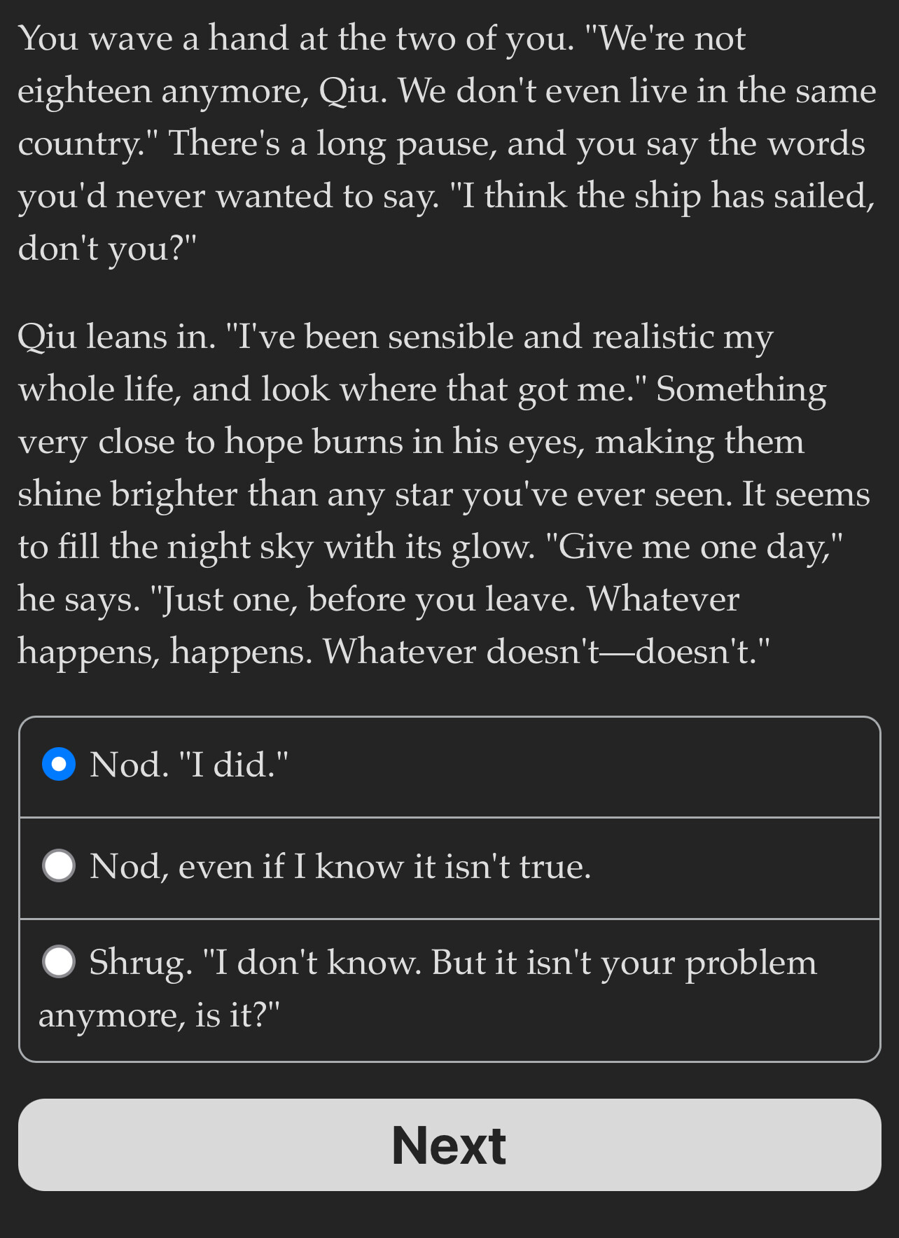 @J_N Totally see hat youâre saying - in the latest edits, I wanted to prune some of these branches so it doesnât end up being too unwieldy for me to keep track of all the ways MC can potentially feel about Qiu in the past.