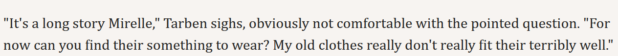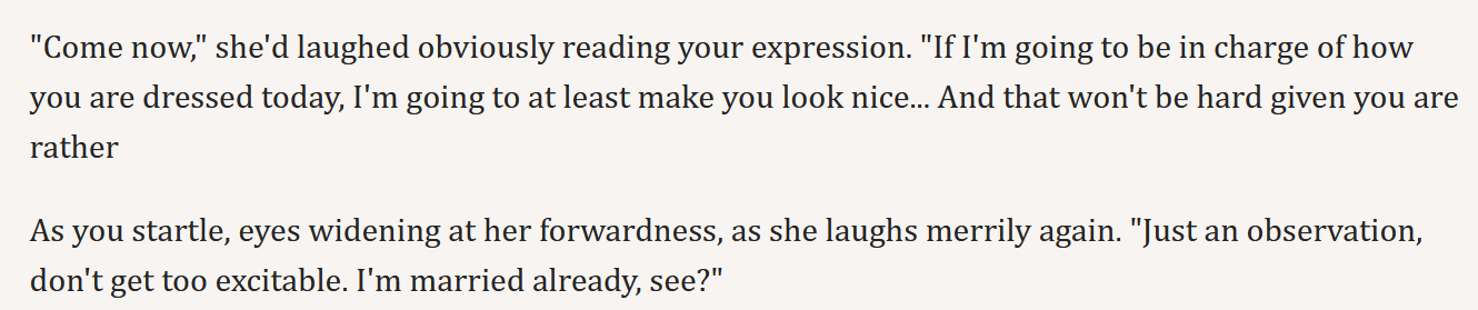 “I still say a dress would have been nicer, but that colour… yes, that suits you beautifully my dear. I thought it would. Doesn’t she look lovely #{ROname}?” The shopkeeper gives him a deliberate nudge with her elbow.