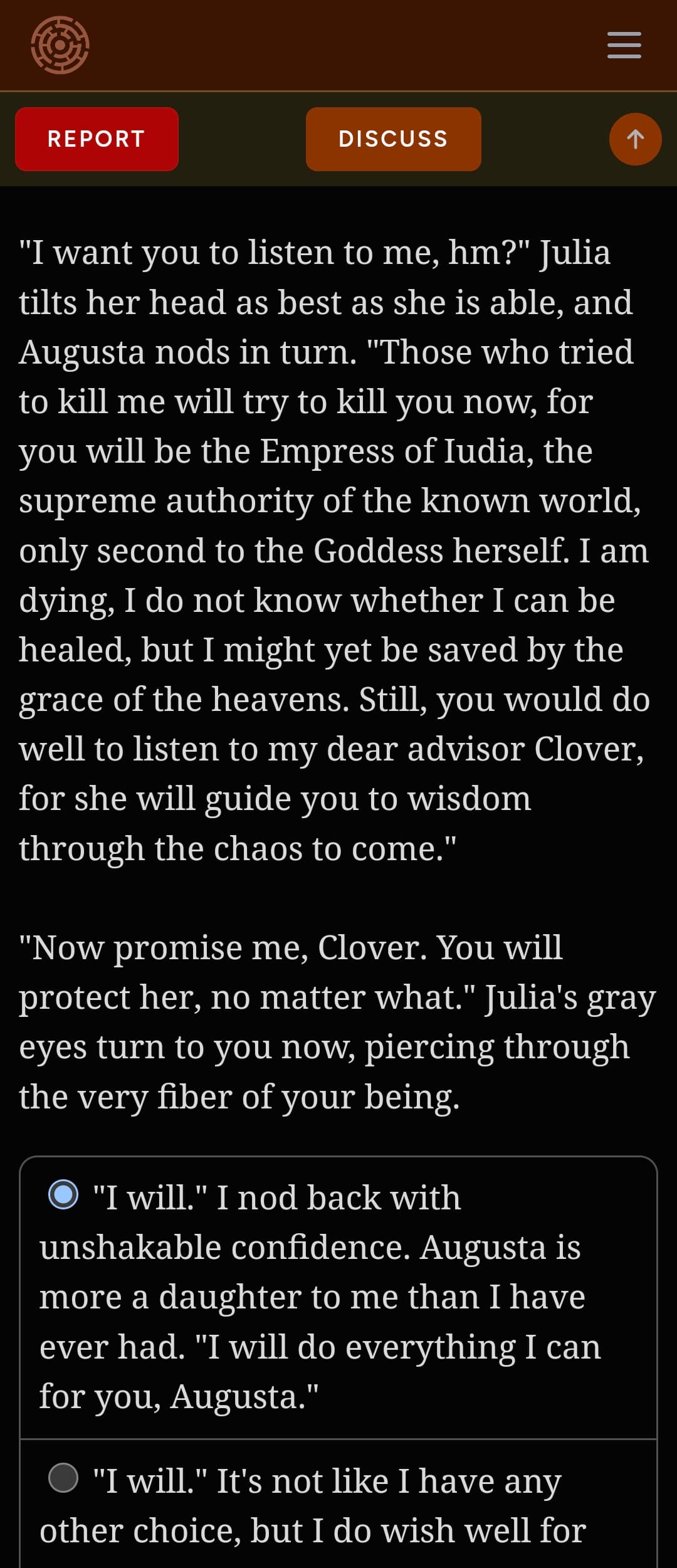 After the empress’s poisoning, I was prompted to respond to her request for support. Clicking the top option causes an error message to pop up saying an achievement wasnt marked as such earlier in the game’s code.