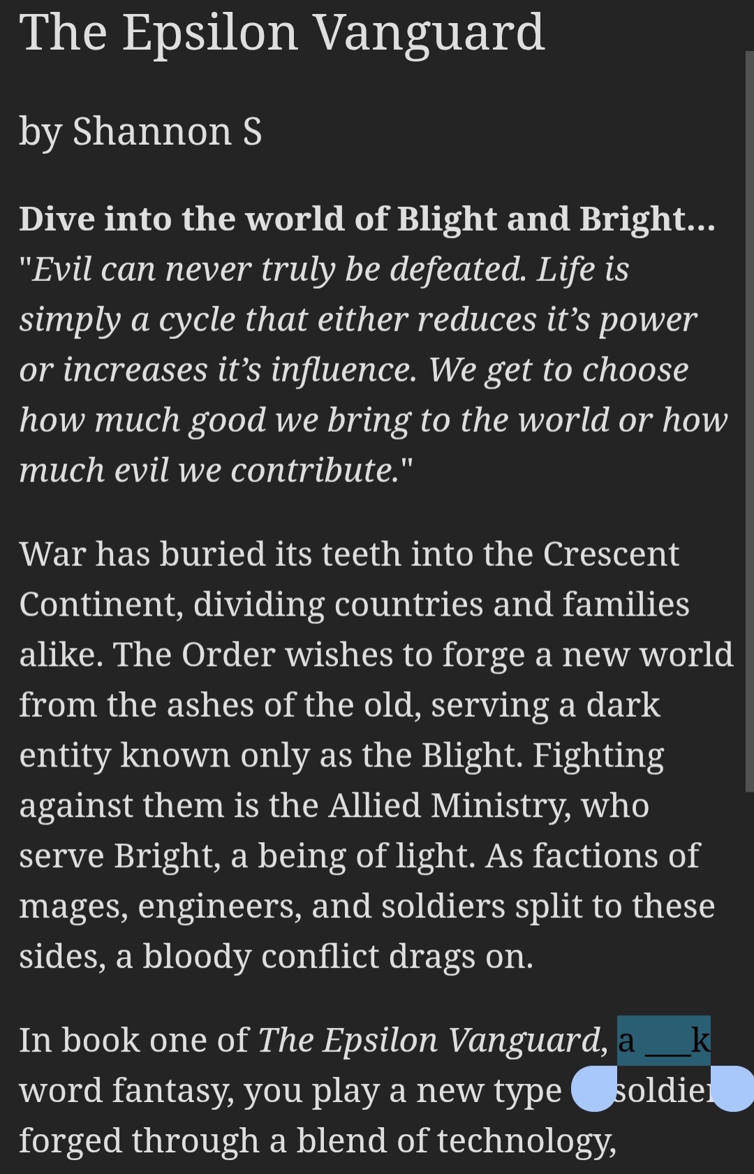 In book one of THE EPSILON VANGUARD you play a new type of soldier forged through a blend of technology, biology, and magic. Guide them through the frontlines of a world divided into a large-scale war. Choose how your Vanguard develops. Will it learn the intricacies of emotions and become more human, or lean into its machine origins and become a ruthless weapon of destruction? How will you contribute to the world as it descends into chaos?