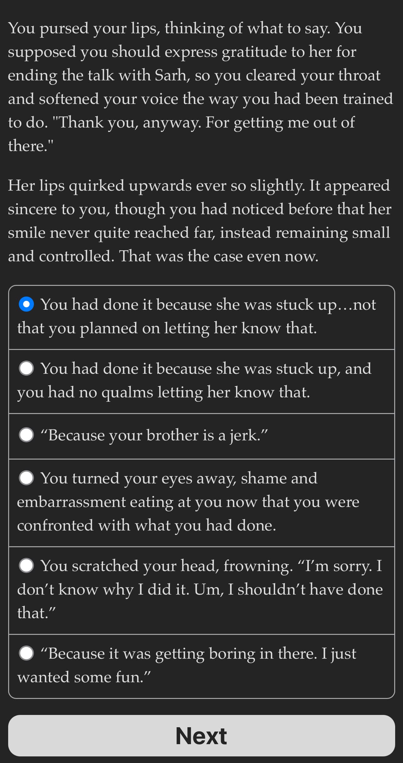 ✢ Choices that shape your MC’s personality as well as the world around them to a lesser or bigger degree and narrative branching based on certain choices.
